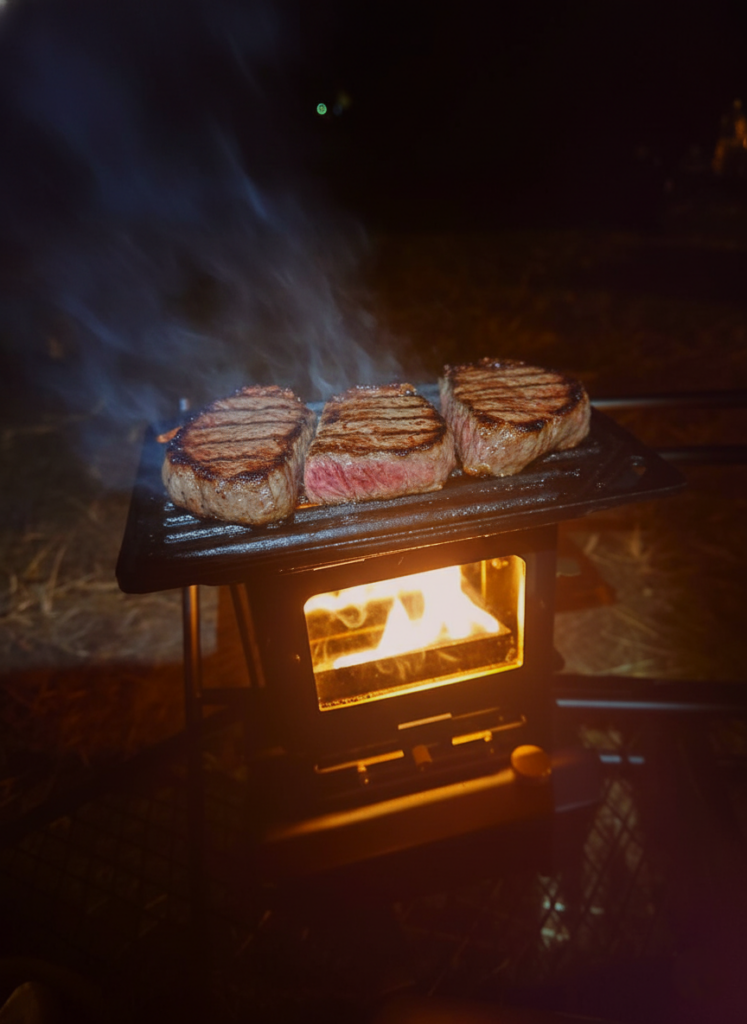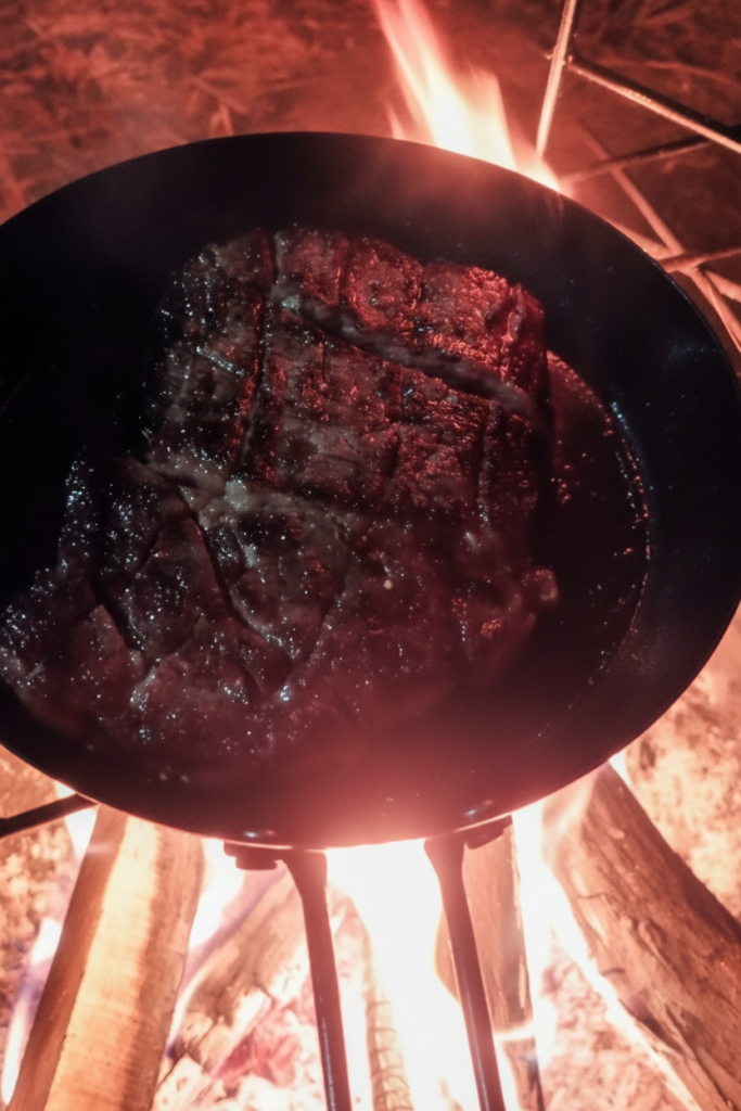 先程ご紹介したアイロンストーブで男の定番『ステーキ』 いい色合いで焼けていますが・・・