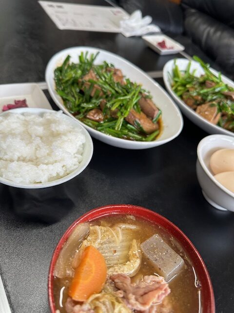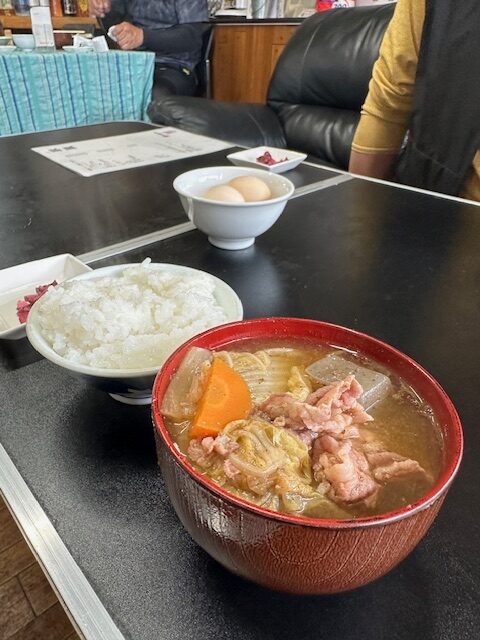 最初にやってきたのは定食のごはん+豚汁+生卵