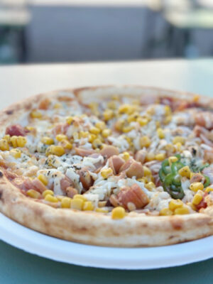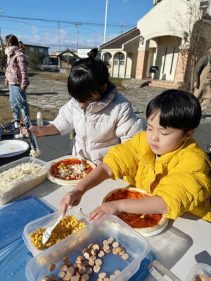 炎の中で一枚一枚丁寧に焼かれるピザは、香ばしい香りとともに会場の期待感を高めてくれます。焼きたてのピザを頬張る瞬間には、子どもも大人も思わず笑顔に。屋外のテーブルで囲む食事は、いつも以上に特別な時間となりました。世代を超えて交流できる、あたたかく和やかなひととき。