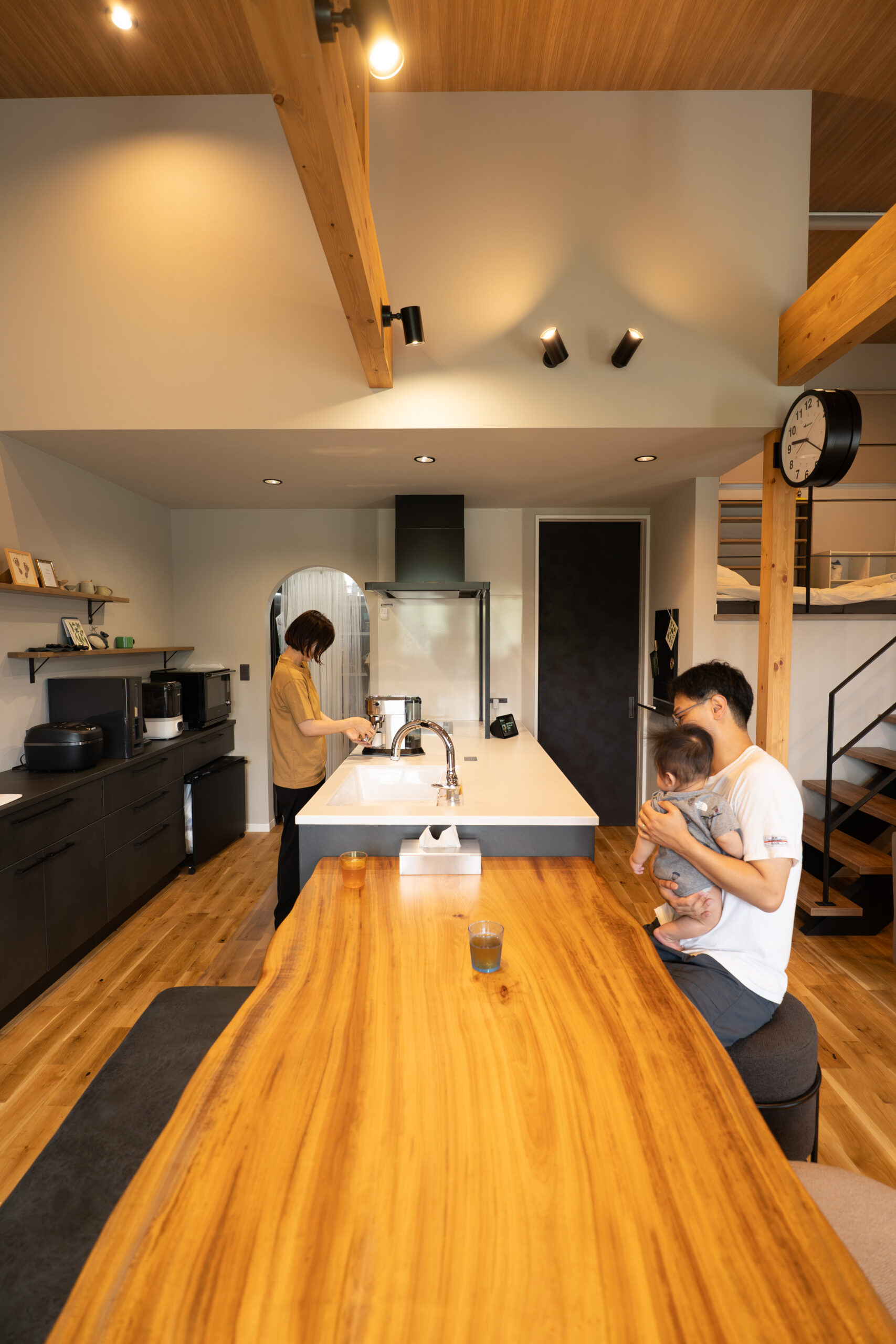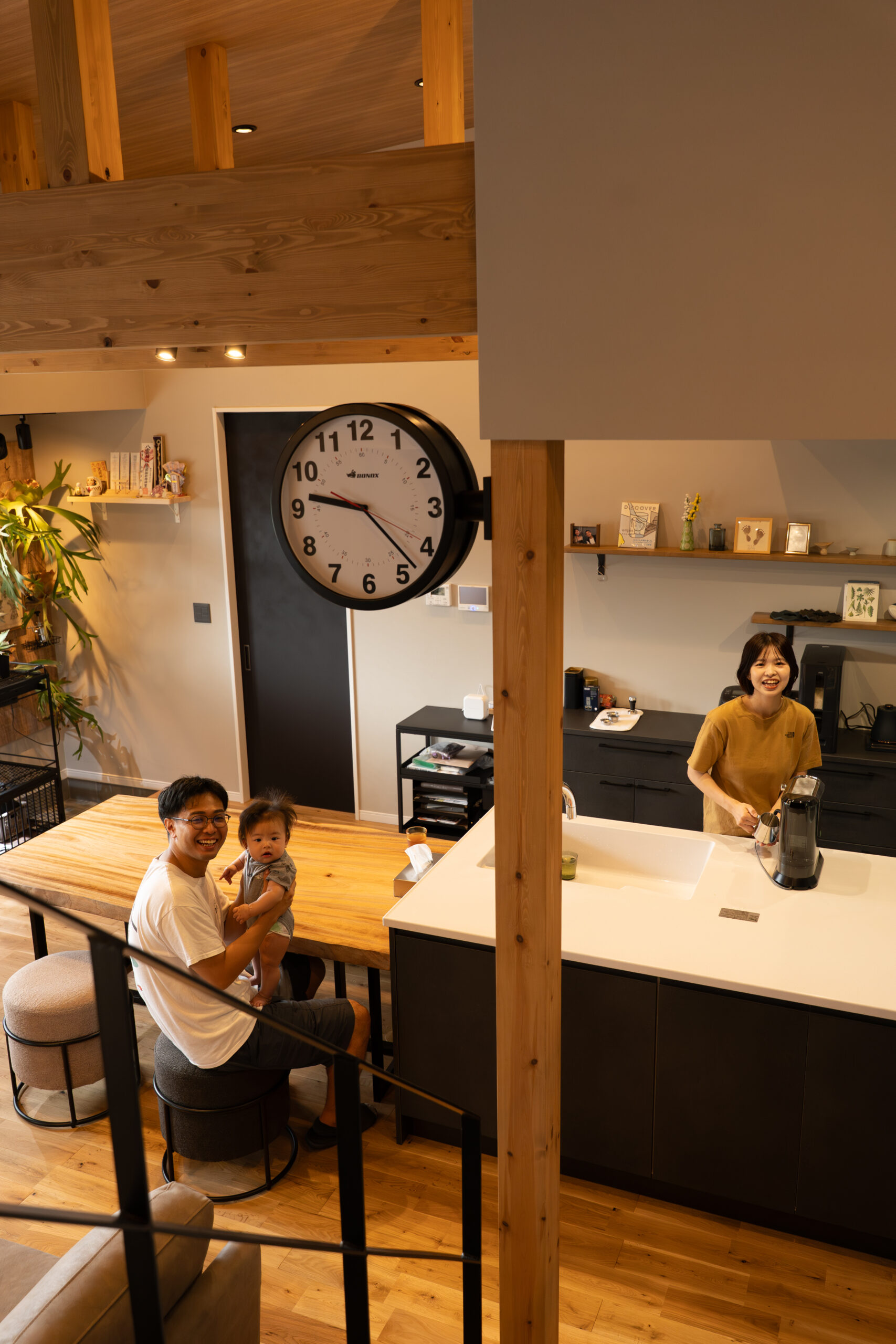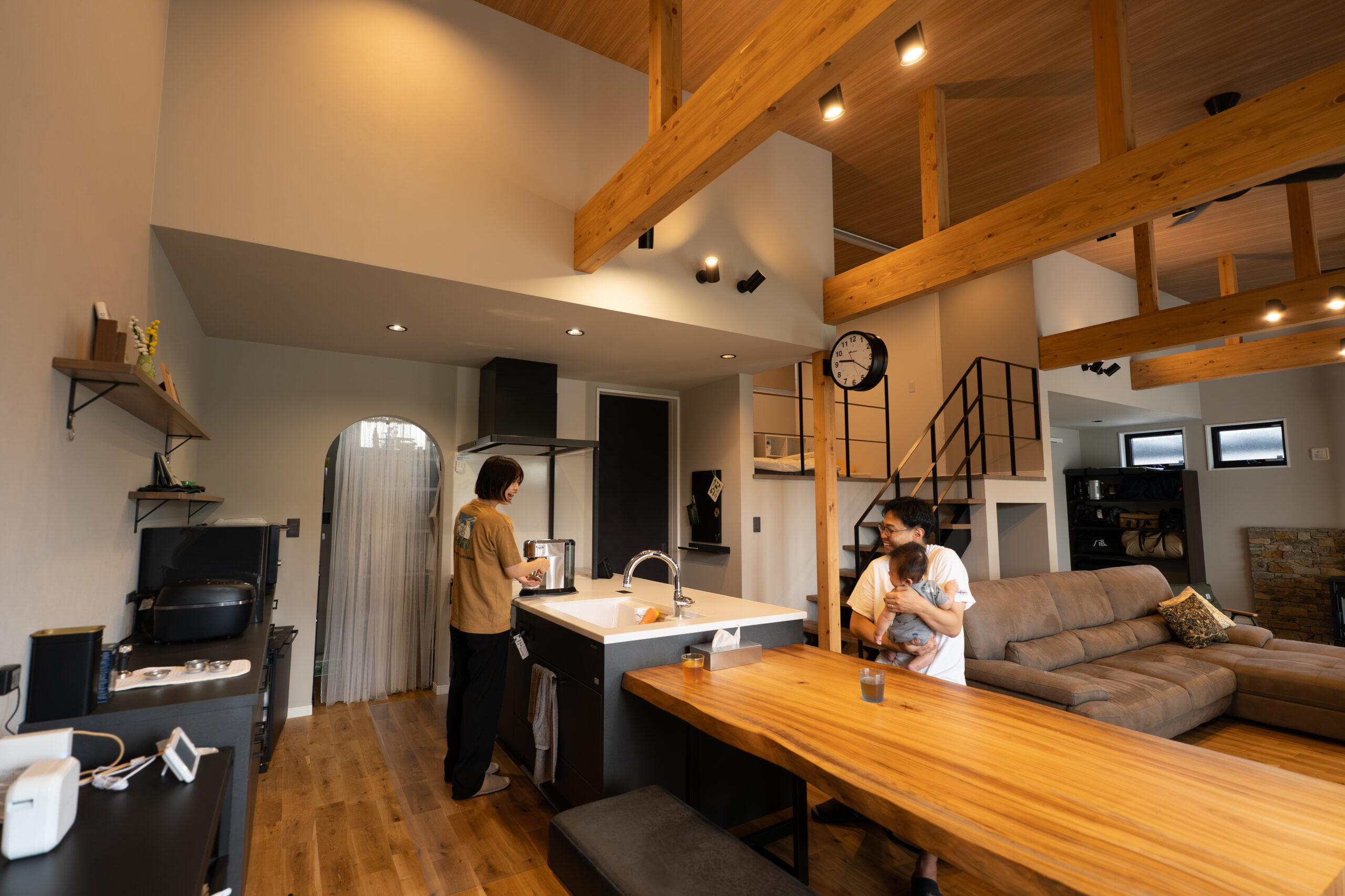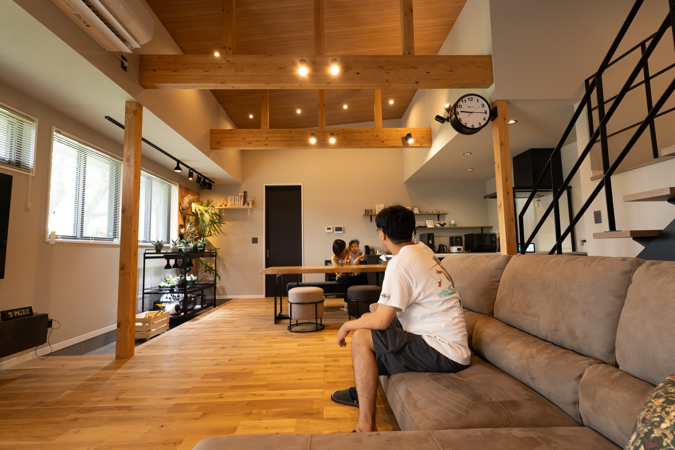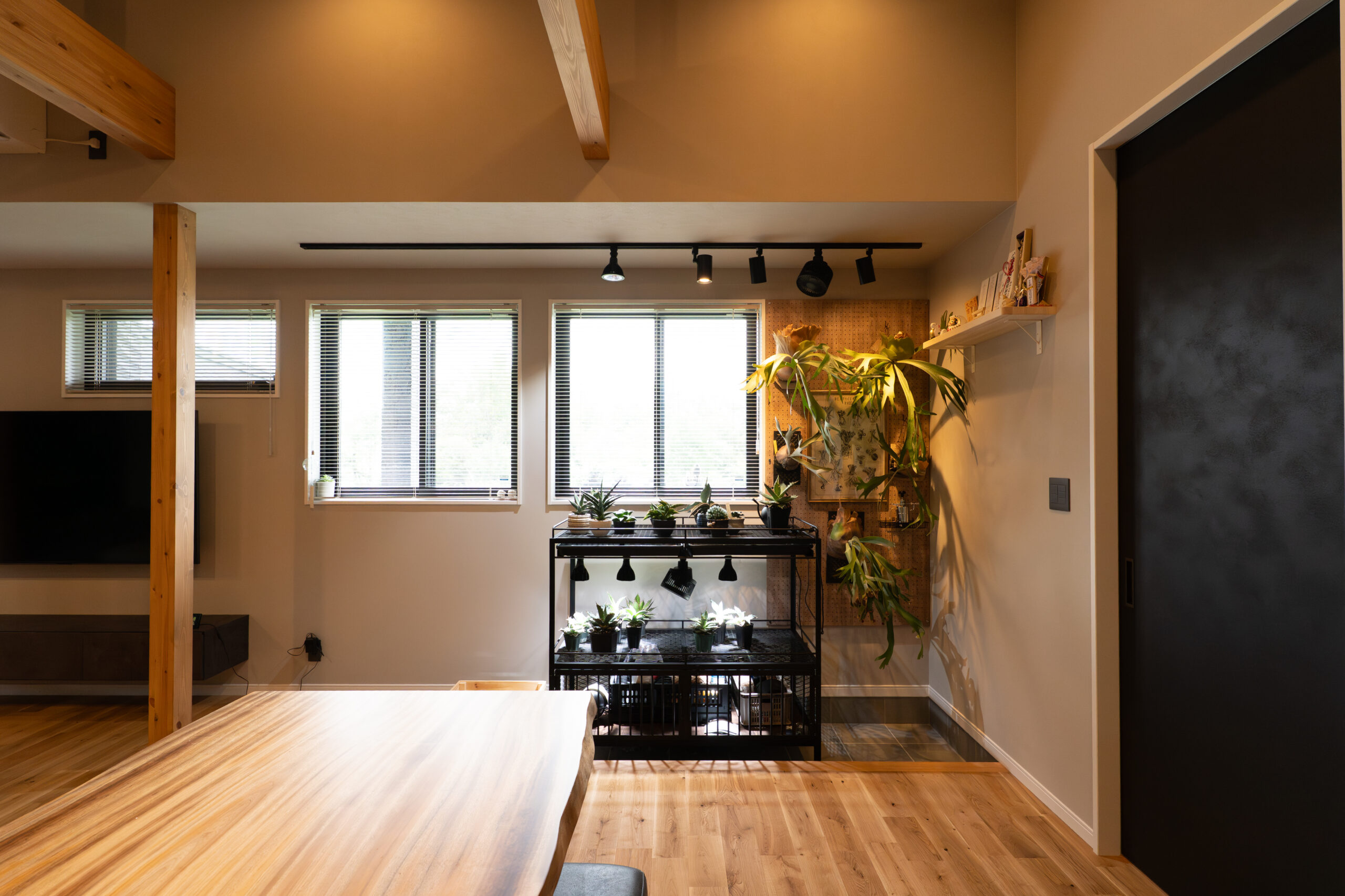 天井の高い開放的な空間で、広々としたリビングに光があふれ、趣味の植物をのびのびと育てながら、自然と調和する暮らしを楽しんでいます。家事動線が格段に良くなり、無駄な時間が減ったことで、お互いに自由な時間が増えました。