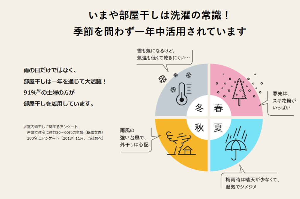 雨天時や花粉シーズン、夜間でも安定して洗濯が可能となり、生活リズムに柔軟性が生まれます。
